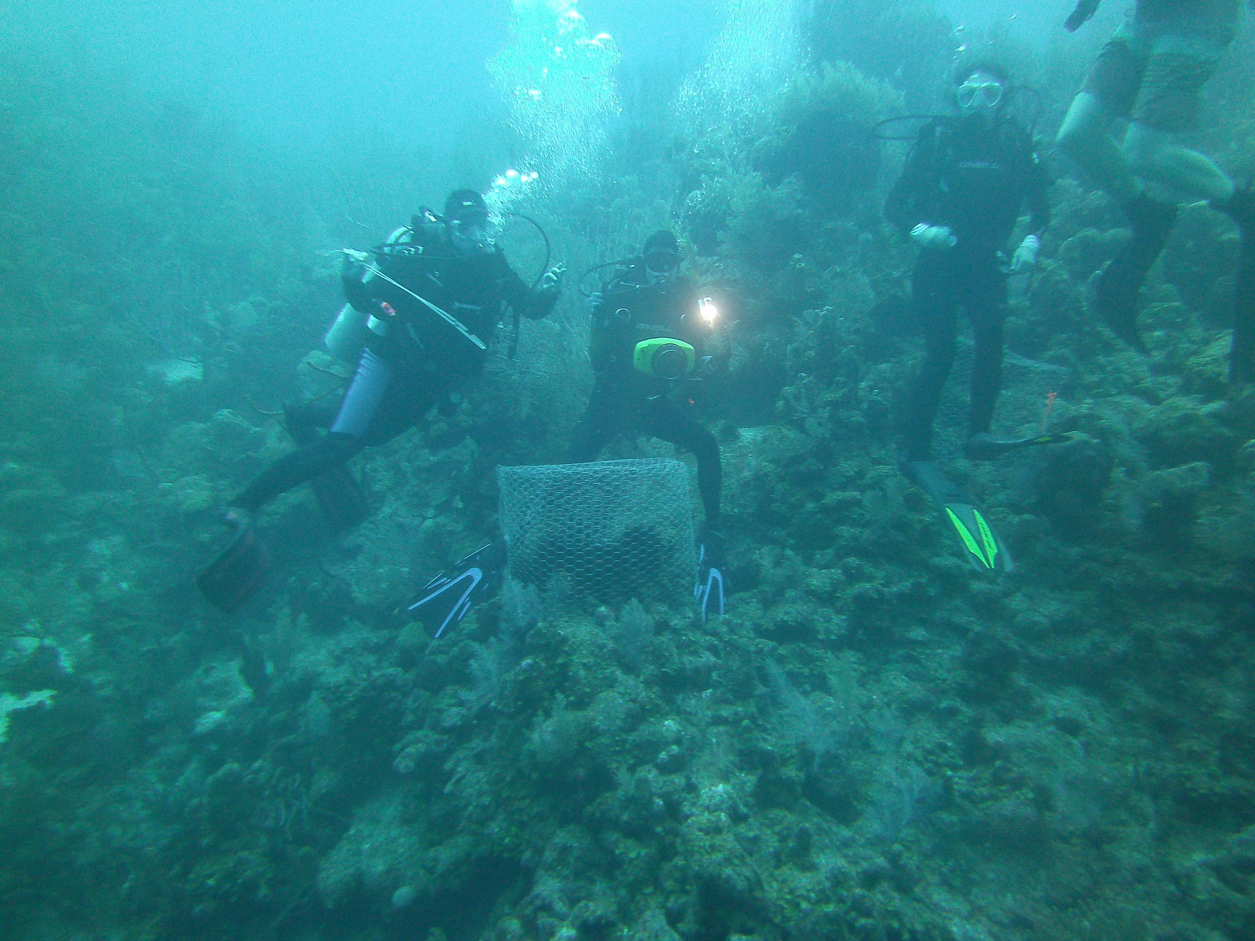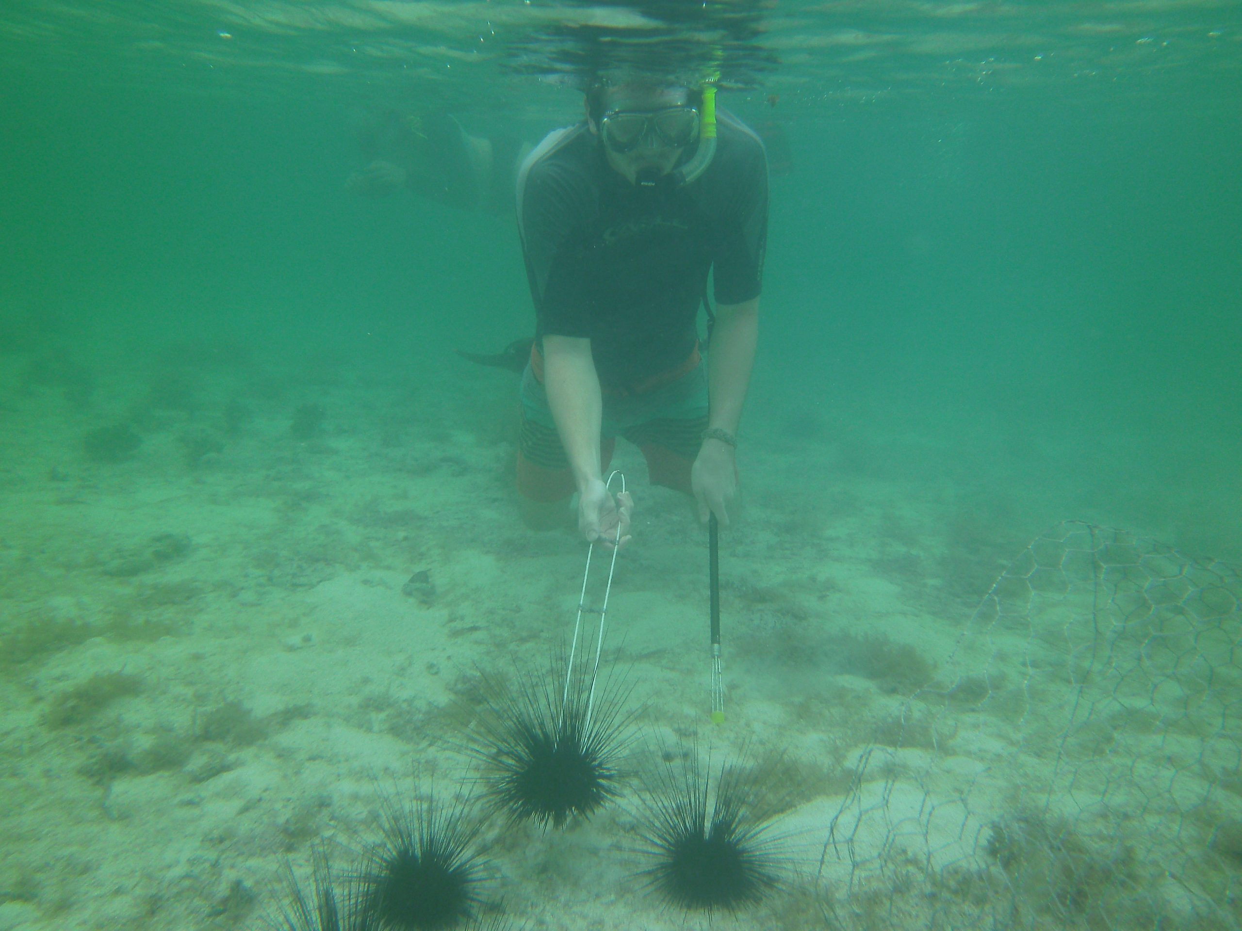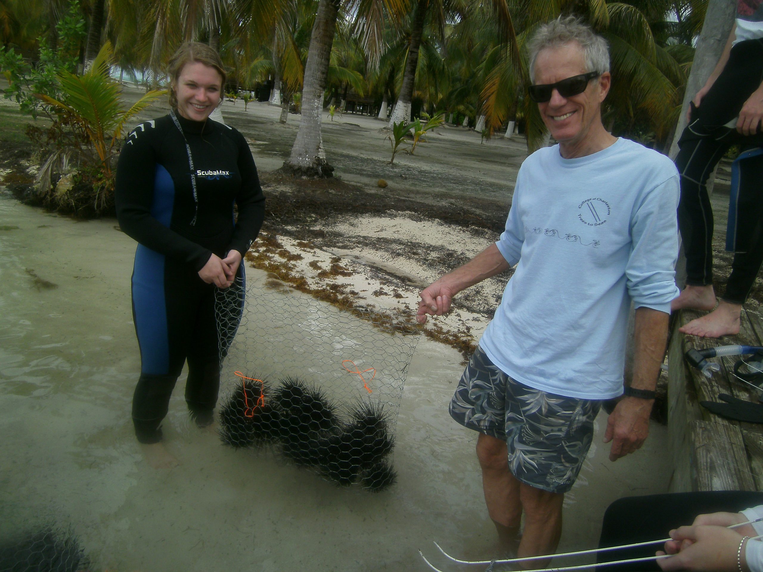 Sea Urchins are not charismatic marine fauna, but they are insatiable herbivores, which means they eat algae. In the early 1980’s the Caribbean lost it’s most voracious herbivore, the long spine sea urchin (Diadema antillarum). My colleague Phil Dustan and I had conducted experiments in Jamaica and Belize and found that Urchin foraging significantly reduced the macro algae and turf algae layer that had smothered corals. Our idea was to take some urchins that were living in shallow reefs and bring them down to deeper reefs (60 ft- 90ft) that had been covered in algae. The premise of this study was to promote “Reef Self Restoration”. By this I mean helping the natural Biology recover so that it can be resilient and self-sustaining. We realized that divers might enjoy planting sea urchins on the reef as you would a coral. So we brought a group down and let them conduct the experiment.